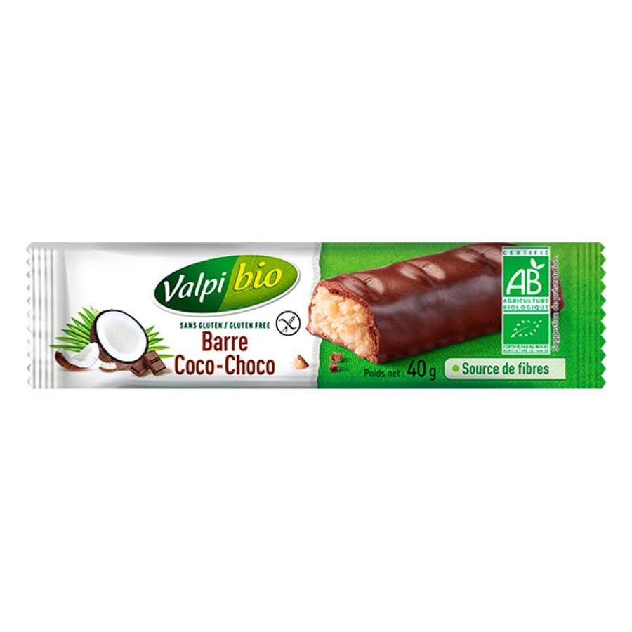 1. Barre à la noix de coco sans gluten, enrobée de chocolat noir, issue de l’agriculturebiologique, adaptée aux personnes intolérantes au gluten.Source de fibres