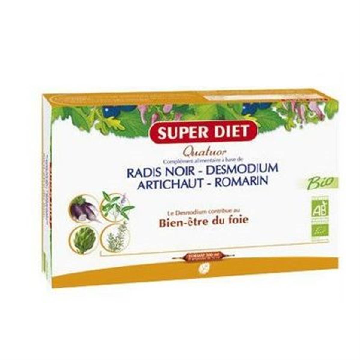 1. Les Laboratoires Super Diet ont sélectionné pour vous ces 4 plantes Bio : Le Chardon Marie qui aide au bon fonctionnement du foie et agit en tant que draineur hépatique. Le jus de Radis noir, légume emblématique de Super Diet depuis 1974. L'Artichaut qui contribue à l'élimination rénale. Le Romarin reconnu pour ses propriétés culinaires et gustatives.