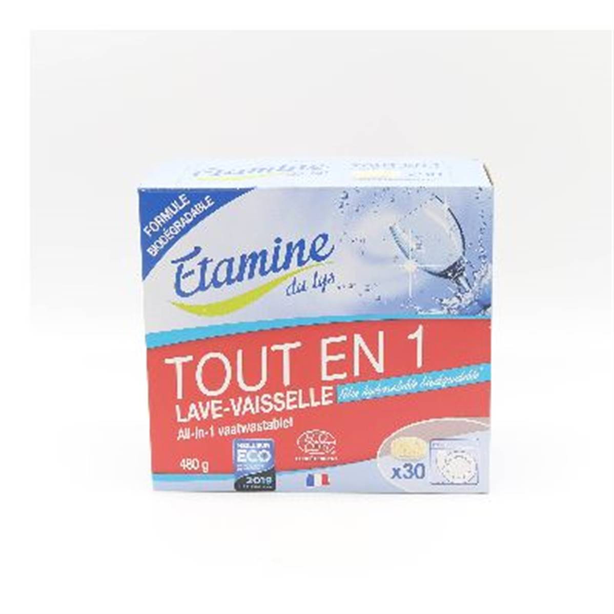 1. Tablette certifiée écodétergent Tout en 1 : lavage, fonction sel, rinçage et protection de la machineFilm hydrosoluble biodégradableFabrication française30 lavages
